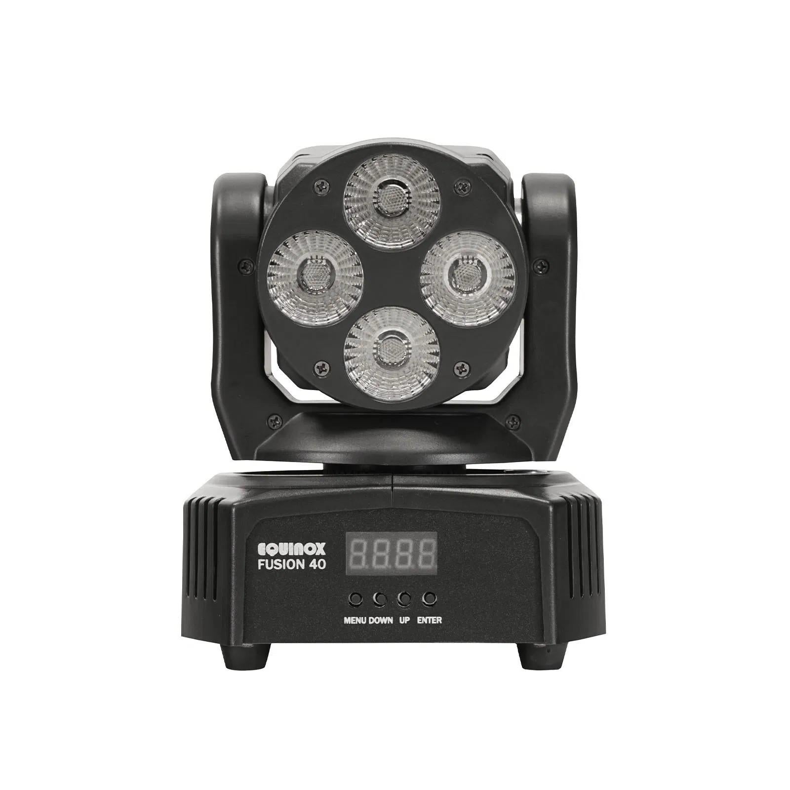 Versatile and lightweight, the Equinox Fusion 40 pack includes 2 ultra compact moving heads, both housing 4 x 9W quad-colour LEDs, that deliver smooth colour mixing. The Fusion 40 heads are also loaded with advanced internal programming and can be operated through a variety of modes including DMX, auto, sound active, strobe and master/slave modes, allowing stunning light shows. Ideal for mobile DJs and performers.